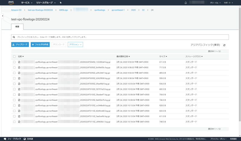 フォルダ階層は{バケット名}/AWSLogs/{アカウント番号}/vpcflowlogs/ap-northeast-1/{年(西暦)}/{月}/{日}となります。